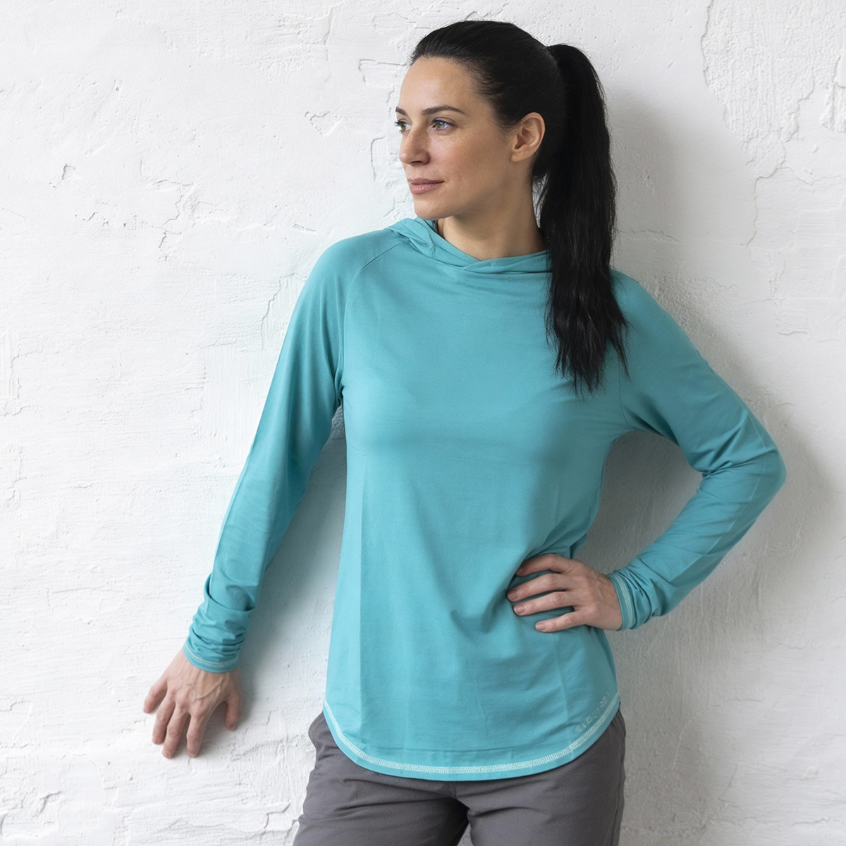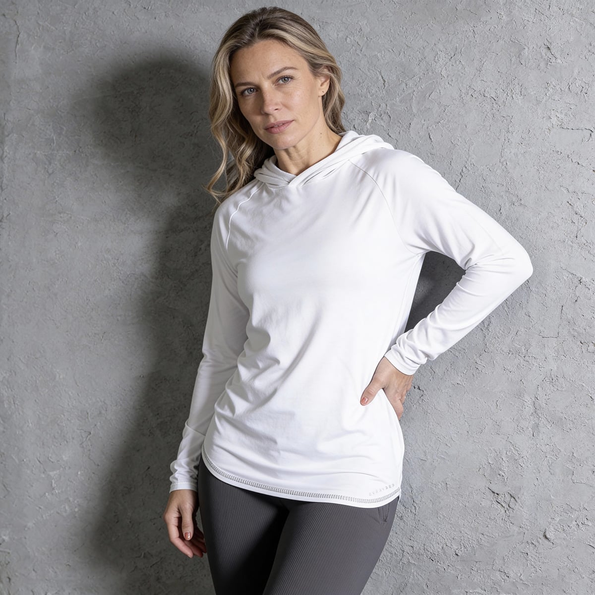 The open, moisture-balancing structure keeps air flowing while providing gentle stretch and shape retention, creating clean, effortless comfort without the heaviness of traditional hoodies.